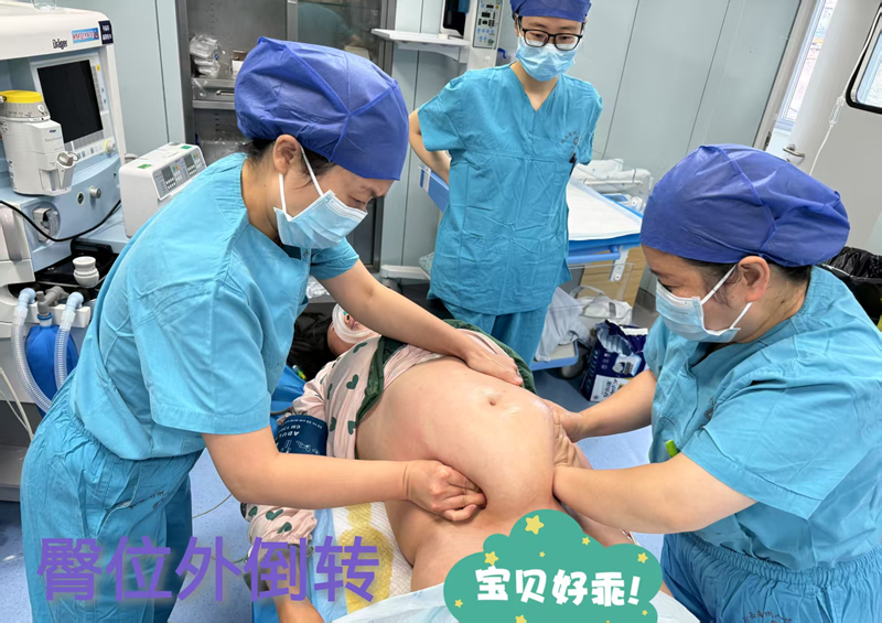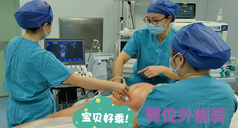 臀位外倒转技术 臀位外倒转是我院实施的特色项目,每年为上百例臀位宝宝实施华丽转身为头位,圆了孕妇能经阴道分娩的期盼。