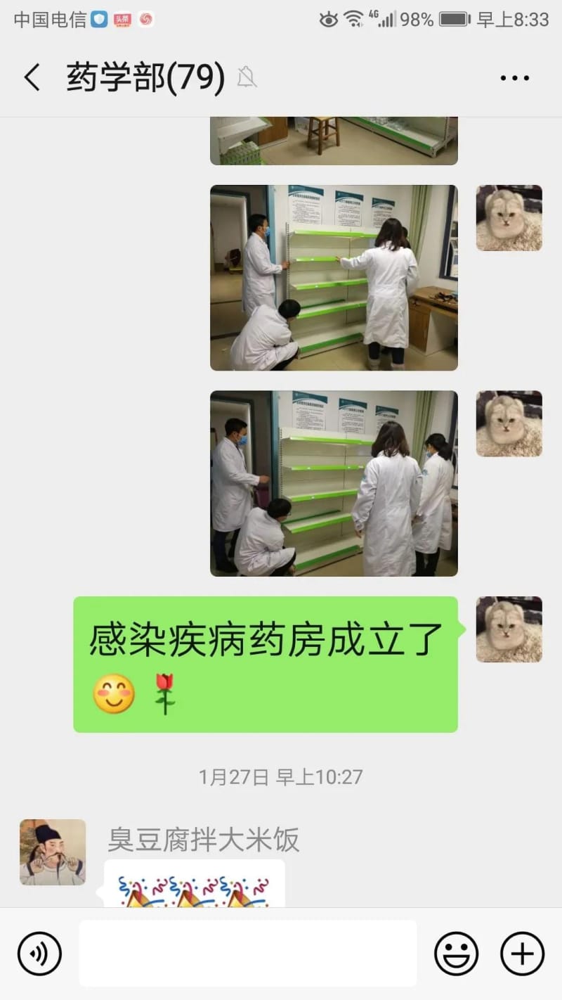 1月25日(大年初一)上午,为避免院内交叉感染,保障“新冠肺炎”患者的就治取药全过程在隔离区内完成。紧急组建了“感染性疾病药房”,在人力资料紧张情况下,住院药房、门诊药房的同志志愿放弃休息,共同承担新建“感染性疾病药房”的工作,保障临床24小时取药的需要。