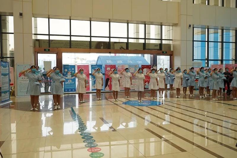 5月12日上午,州人民医院门诊大厅如往常一样繁忙紧张,挂号、取药、等待检查报告,人来人往。忽然,一个响亮的声音从人群中传出,原本紧张的门诊大厅渐渐安静下来,身穿蓝色护士服的48名护士突然登场,迈着整齐的步伐,快速集结到门诊大厅入口,誓言的力量伴着悦耳的音乐,接过前辈手中的护士帽,踩着节拍迎面走来,从此,她们正式成为护士,传承着守护生命的重任。
