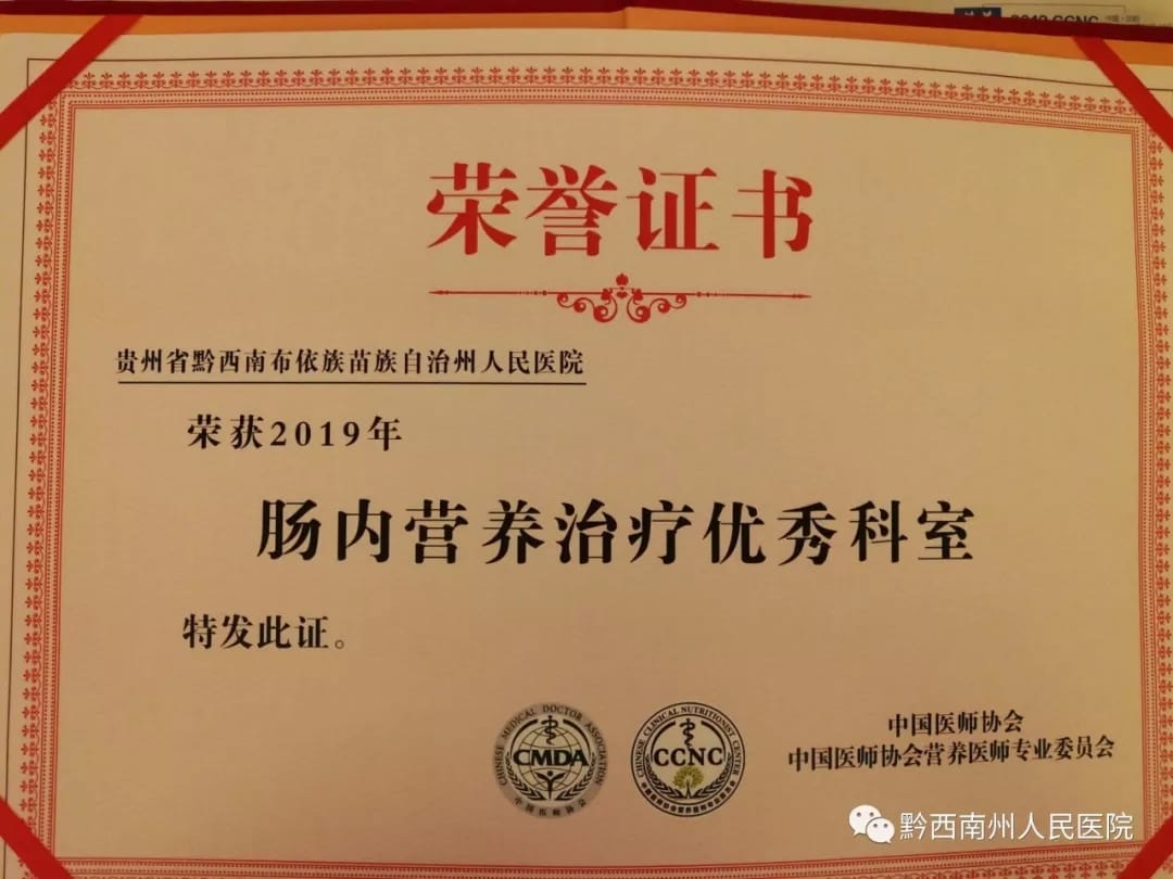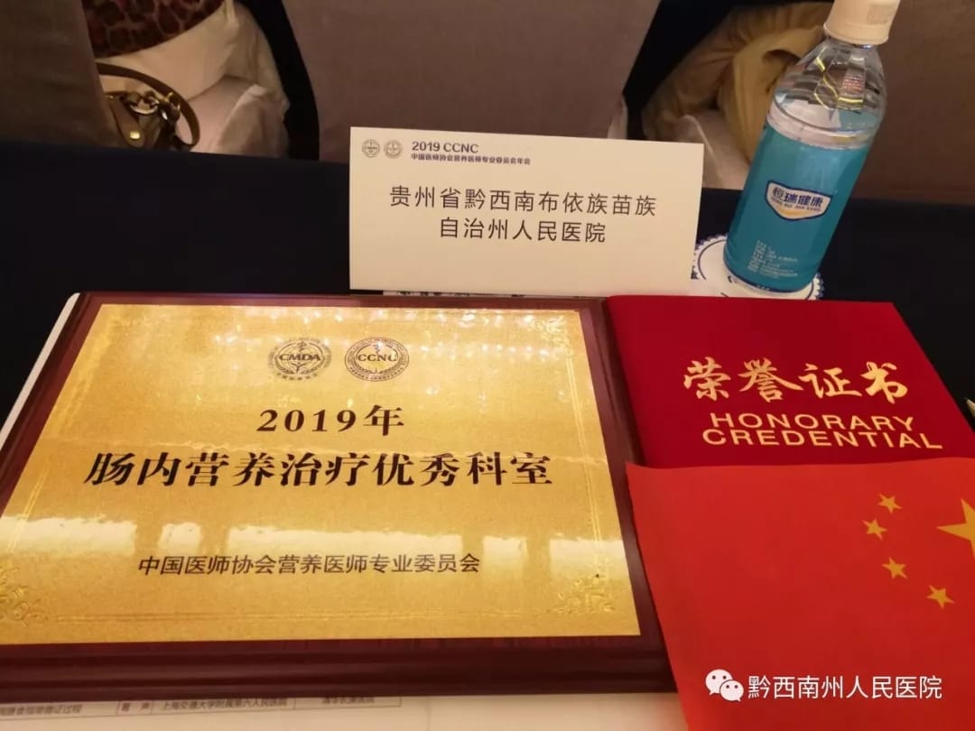 2019年8月16日,由中国医师协会、中国医师协会营养医师专业委员会主办的中国医师协会营养医师专业委员会年会暨成立十周年学术会议在沈阳召开。会上,黔西南州人民医院临床营养科荣获“肠内营养治疗优秀科室”称号。