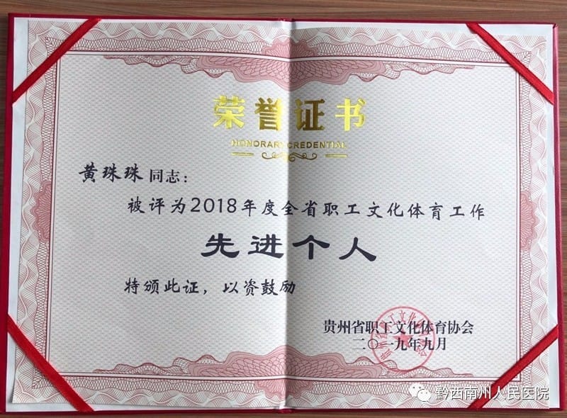 近日,贵州省职工文化体育协会发布了《关于表彰2018年度全省职工文化体育工作先进集体和先进个人的决定》,我院工会黄珠珠同志荣获“2018年度全省职工文化体育工作先进个人”称号。