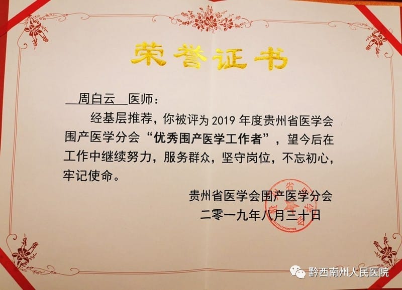 8月30日,在贵州省医学会围产医学分会年会上,我院产科周白云主任、新生儿科吴顺芬主任获得了优秀围产工作者表彰,并成功当选了第四届学会委员,王卓医师当选为青年委员。