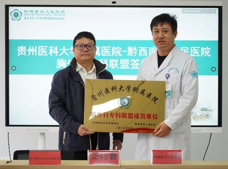 为提升胸外科诊疗方面深度合作,优化医疗资源配置,为患者提供更优质的医疗服务。10月28日上午,贵州医科大学附属医院胸外科与黔西南州人民医院胸外科举行专科联盟授牌仪式。贵州医科大学附属医院胸外科主任李剑、护士长曾燕等5位专家、州人民医院党委委员、副院长钟华俊、医务科、护理部、胸外科负责人及业务骨干参加授牌仪式。
