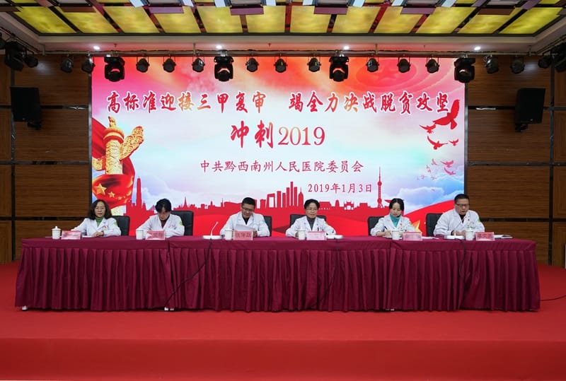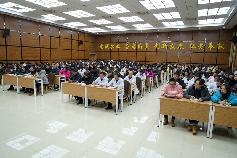 为号召全院上下迅速行动起来,以奋发有为的精神状态、扎实有效的细致工作,投入到三甲医院复审迎评中,确保三甲医院复审顺利通过,2019年1月3日晚19:00时,我院在行政楼多功能厅召开三甲复审工作冲刺推进会。院领导张传跃、代时莉、黄玉梅、白宁艳、景秋、李文茂及全院各临床、医技、行政职能负责人、三甲联络员,共计200余人参加了会议。